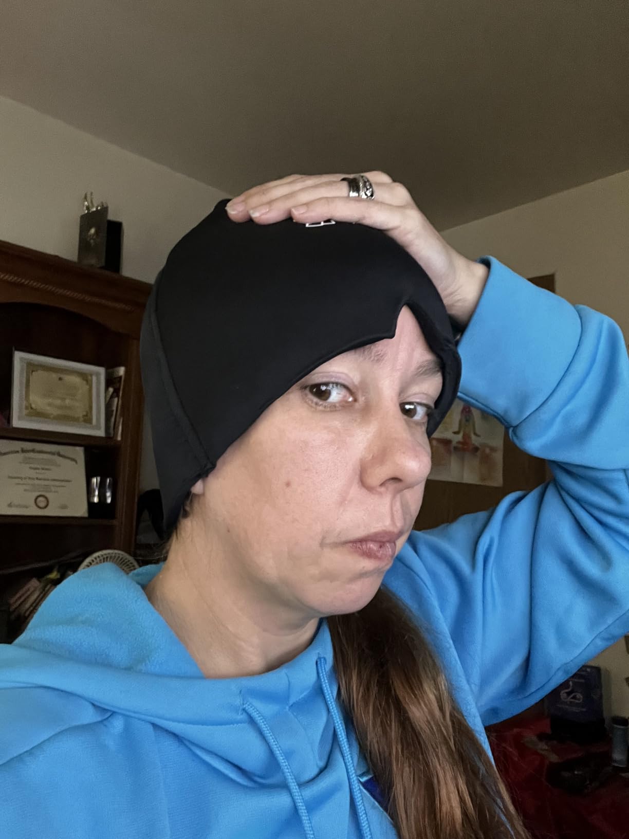 The cap uses 360° Neuro-Cooling Technology - the gel stays flexible even when frozen, conforming to your head shape while the soft fabric ensures comfort against your skin.